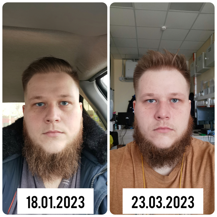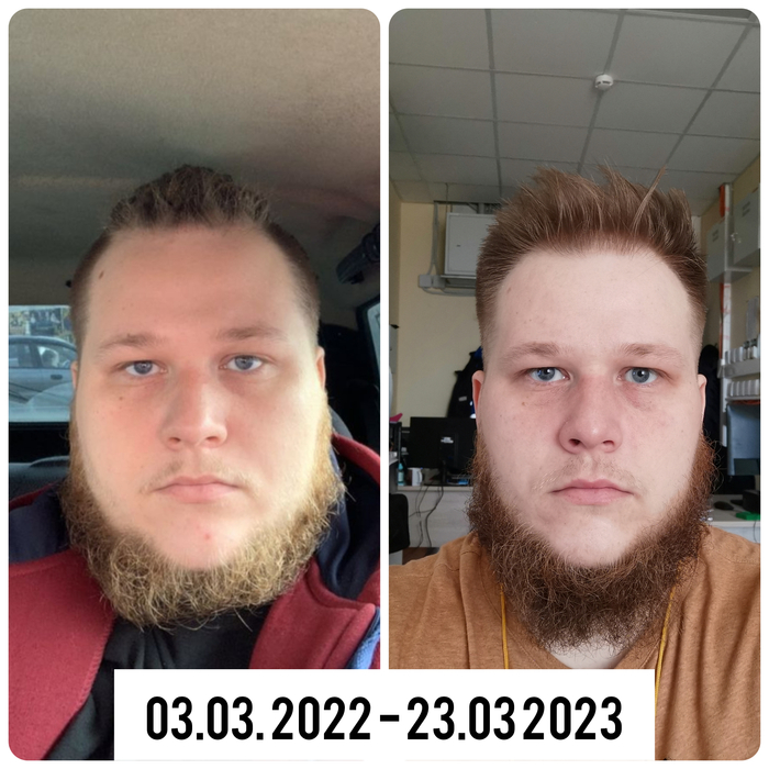 Возможно, вам покажется, что кроме бейджика на шее и штанов не поменялось ничего, ОДНАКО! Между фотографиями 19.9 кг разницы!
