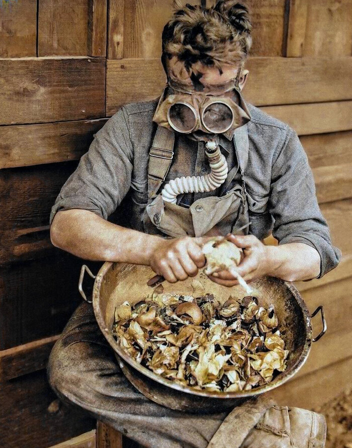 Проверка противогаза во время чистки лука. Лагерь Кирни, Сан-Диего, США, 1918 год.