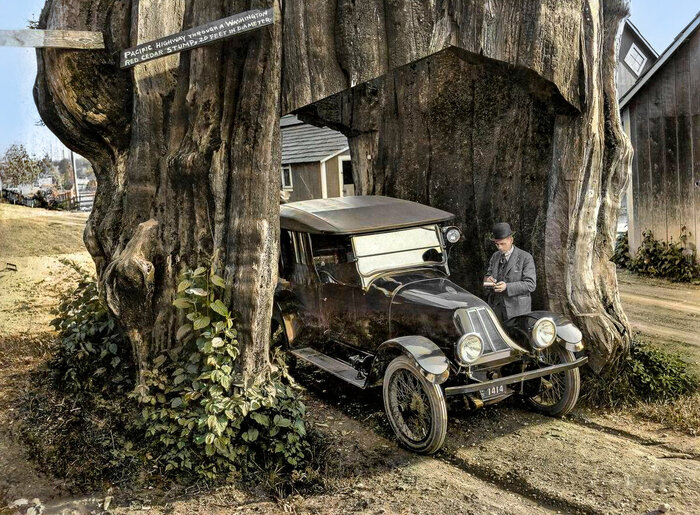 Тихоокеанское шоссе проходит через пень из красного кедра в Вашингтоне, 1920 год.