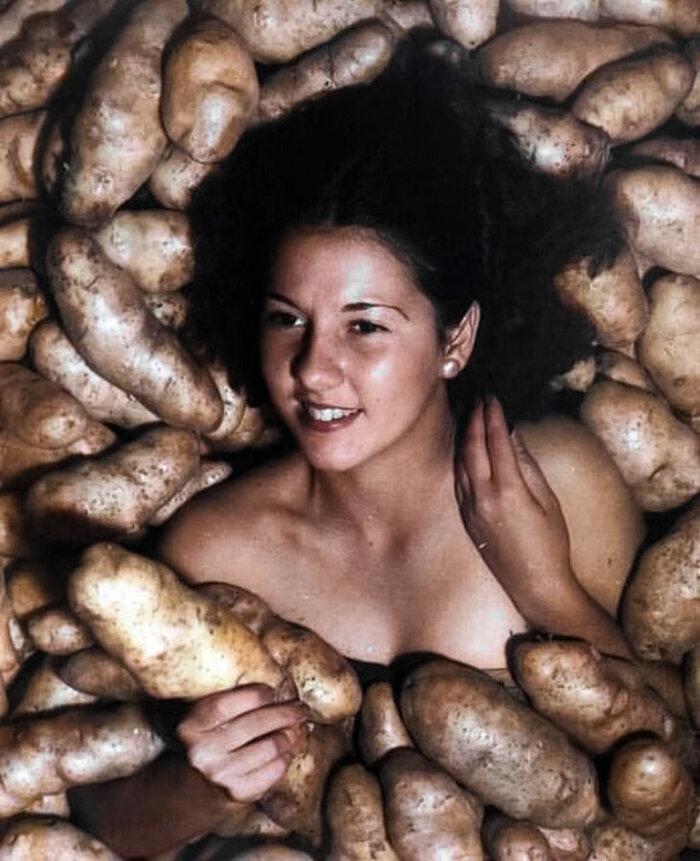 Девушка позирует обнаженной в картошке. Тематические конкурсы красоты были весьма популярны в ХХ веке.