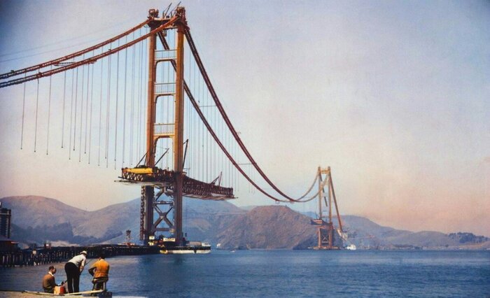 Строительство моста "Золотые ворота". США, Сан-Франциско, 1937 год.