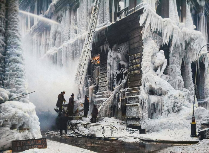 Результат тушения пожара зимой в здании "Эквитебль" 1870 года постройки. Манхэттен, 1912 год.