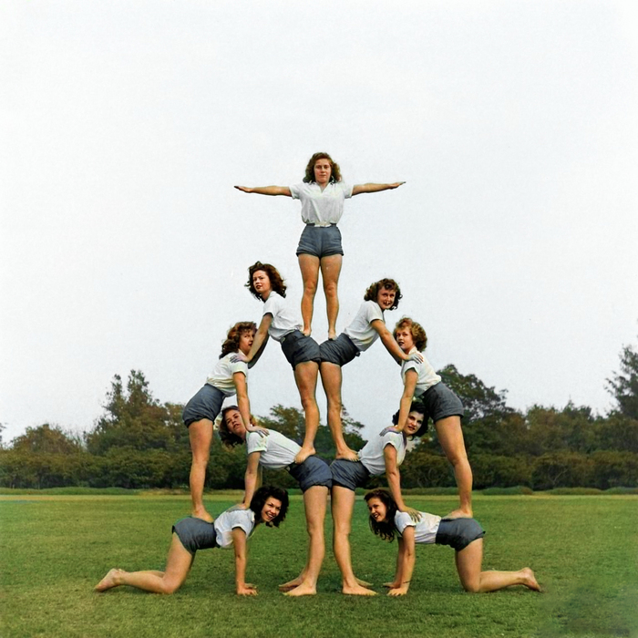 Учащиеся на уроке акробатики в средней школе имени Герберта Гувера в Сан-Диего, Калифорния, 1946 год.