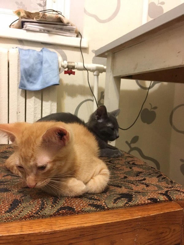 Вчера, в пятницу, возле подъезда кто-то оставил коробку с двумя котами-подростками (мальчики). На вид 3 - 4 месяца. Выглядят ухоженными. Возили к ветеринару, блох и лишая не обнаружено. Дали суспензию от глистов. Собираемся сегодня еще обработать от ушного клеща. Самое главное - приучены к лотку.