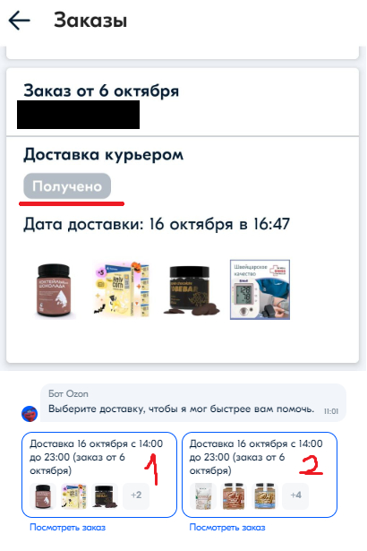 16 октября со мной связывается курьер и привозит одну часть посылки (маркетплейс заботливо ее разбил на 2 части). Спустя пару минут после получения мне приходит оповещение, что я получил обе посылки.