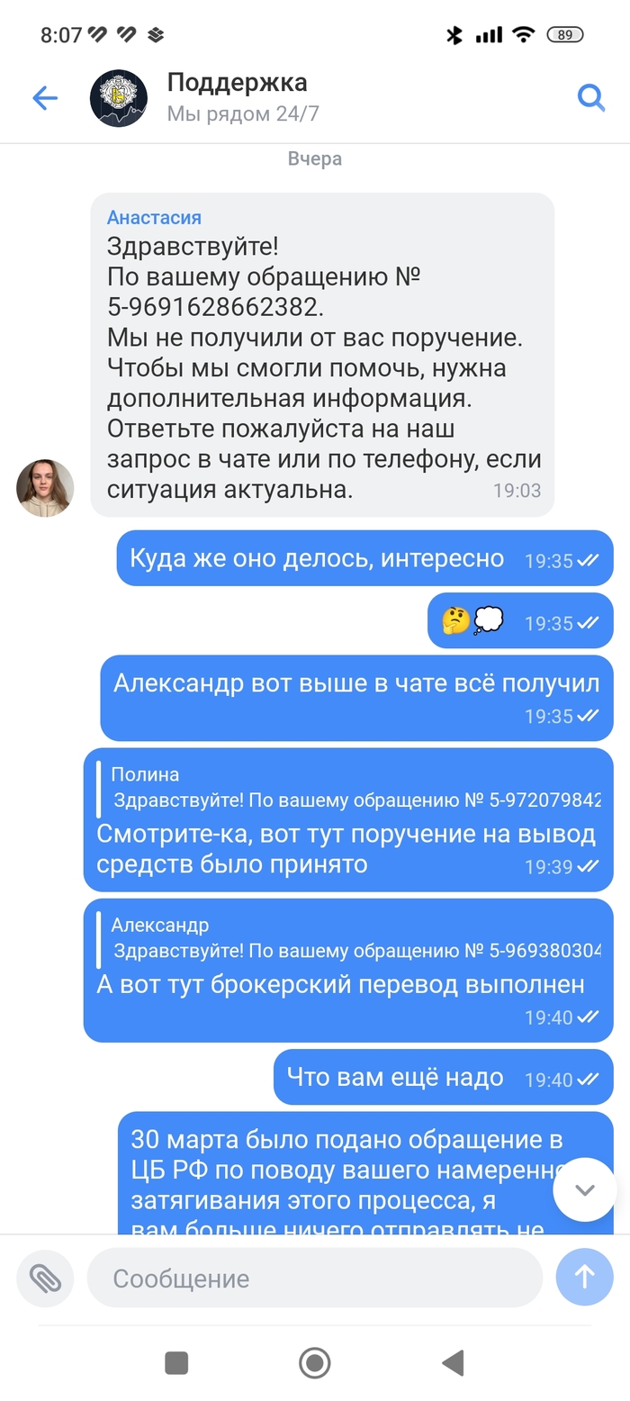 Во-первых, на момент отправки сообщения информация УЖЕ была неверной, поручений понадобилось 2 и я всё ещё ждал их от поддержки. Прислали их через 4 часа после ответа СММ, мелочь, но это враньё, которого по их словам с их стороны нет. Во-вторых, вопрос компенсации не рассмотрели. Это обычный имитатор бурной(и, увы, бесполезной) деятельности для создания положительного образа компании. Он просто где-то врёт, в чём-то извиняется и что-то обещает, короче говоря, вешает на уши лапшу. В целом, глупо ждать помощи в банковской и брокерской деятельности от СММщика. Он даже со своими обязанностями не справляется.