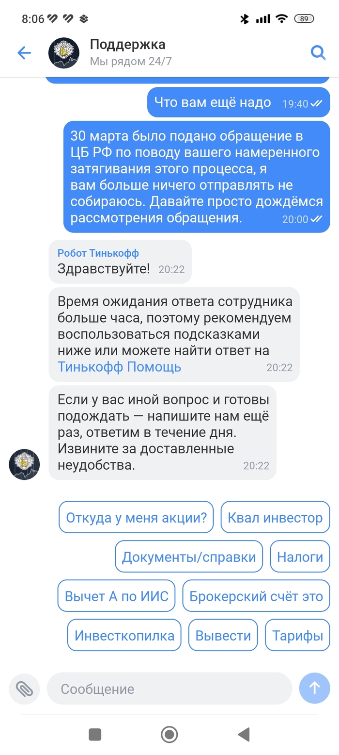 Не сегодняшний день прошел почти месяц с начала моих попыток закрыть ИИС, месяц общения с тех. поддержкой и активных действий, но до сих пор я ни на шаг не приблизился к своей цели. Меня просто пинают от одного некомпетентного сотрудника к другому, просят ждать ответа минимум в сутки на элементарные вопросы. Ничего не напоминает? Беготня от окна к окну, часовые очереди, требования приехать в офис за сотни километров от тебя - Да это же сбербанк 15-ти летней давности! - воскликните вы, и будете правы. Обращение в ЦБ подано, но я сомневаюсь что оно вообще будет прочитано. Больше миллиона рублей сейчас висит просто так и у меня уже опускаются руки.