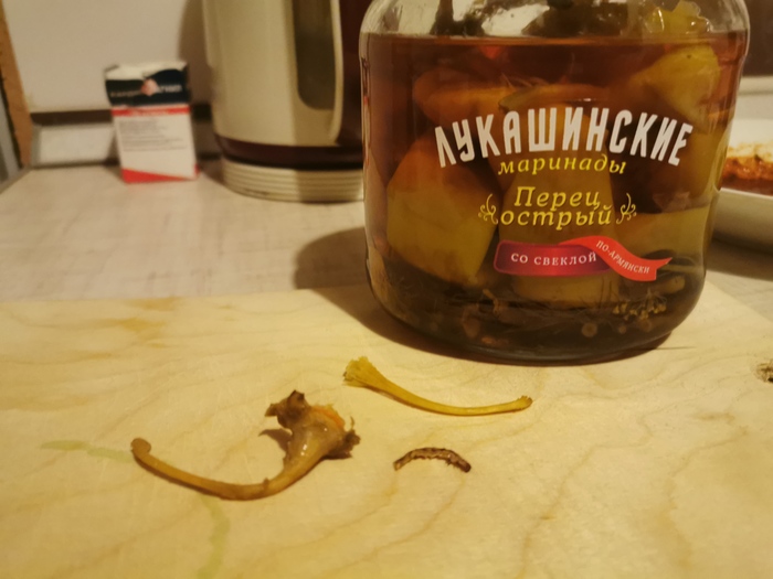Регулярно покупаю продукцию "Лукашинские". Качество и вкус всегда были на высоте. Особенно нравятся "Икра свекольная" и "Перец острый". Который сегодня и купил под медальон с беконом и маленький литр коньяка. Застолье только началось, как заметил вот ЭТО.