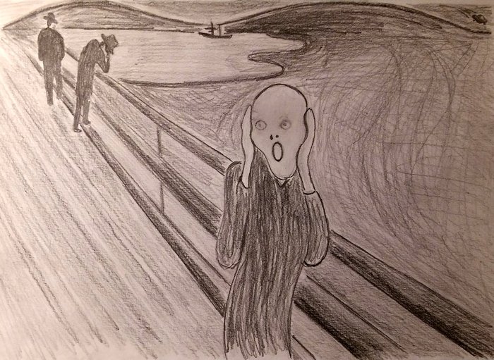 вот этот https://pikabu.ru/story/liniya_myagkim_karandashom_4994137, и так мне понравился рисунок и идея, что решил нарисовать этот карандаш себе, а потом понеслось и еще три части к ему дорисовал. Так что, спасибо за идею, pavelnazim)) Ну и да, это моя вольная интерпретация Эдварда Мунка, ему тоже спасибо!