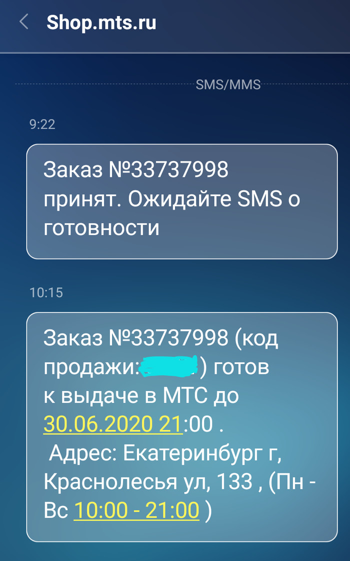 Екатеринбург. Настало время приобрести держатель для смартфона в машину. 28.06.2020 поиском по яндекс-маркету выбрал модель (deppa crab 2) и сделал заказ в интернет магазине мтс (заказ 33737998). Приходит смс с подтверждением о готовности к выдаче.