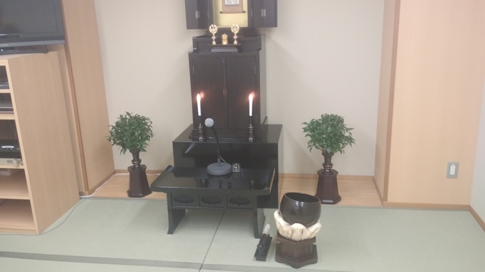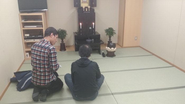 Через некоторое время к нам зашла девушка в костюме и пояснила, что нужно сесть за ней. После этого нам нужно было взять чётки и надеть их на средние пальцы, предварительно перевернув их на 180 градусов, чтобы образовалось что-то типа восьмерки или знака бесконечности между ладоней. После они сложили руки в ладонях и произнеся что-то типа なんべほらんげ, поклонились. Так было повторено три раза. Затем, девушка начала читать молитву (или как это еще можно назвать?), а японец указал мне, где это в книжке.