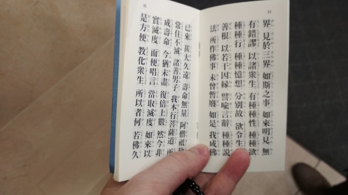 Я даже прикольнулся, что адрес мой для сектантов записывает, чтобы заходили в гости. Затем он дал мне небольшую книжечку, спросив, могу ли я читать. Узнав, что я могу читать только кану (слоговую азбуку), он обрадовался и сказал, что в книжке будет фуригана (фонетические подсказки для иероглифов). Так же я получил чётки со словами, что это для меня и нужно пока убрать в карман.