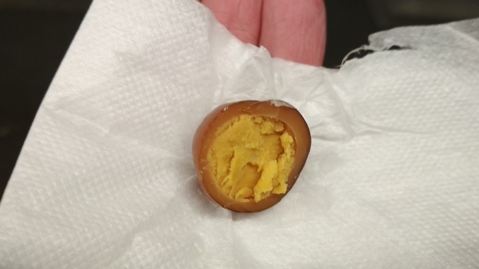 Внутри были самые настоящие перепелиные яйца. Но из-за непонятной обработки, создавалось ощущение, что я ем желток, обвернутый колбасным сыром.