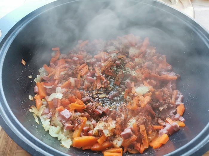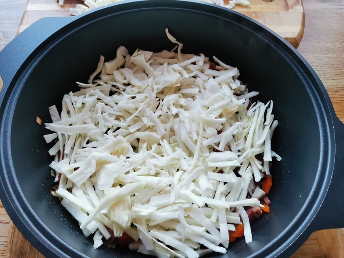 Обжарила их(сразу специи, чтобы раскрылись) и потом, послойно, кладу капусту, присолила, снова капусту.