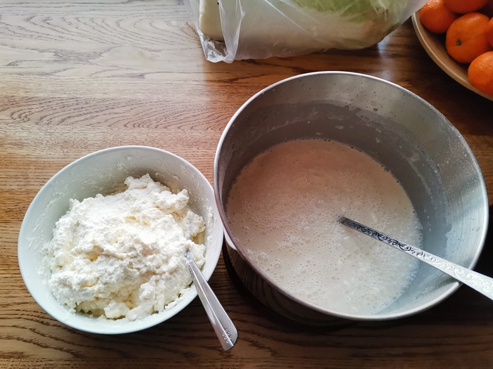 Дальше миксерим до исчезновения комочков. А пока миксер трудится, замешиваем начинку, из 2х пачек жирного творога, 4 ст. л. сахара и 4 ст. л. жирной сметаны. Готово.