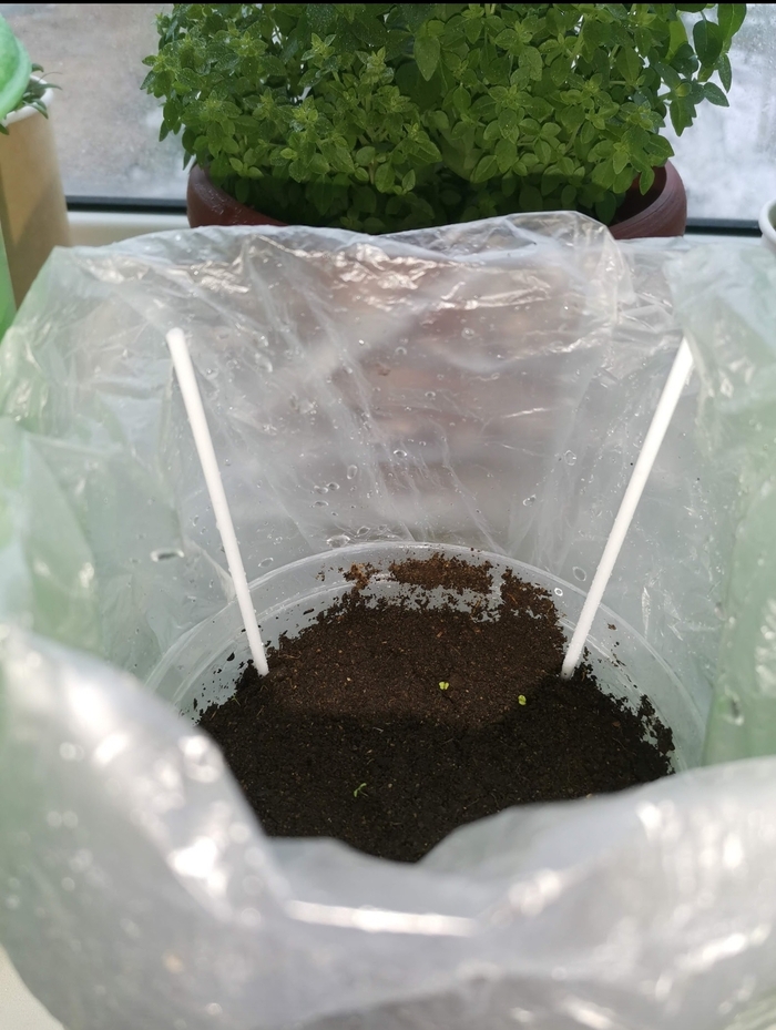 сею семки, щедрой дланью, в широкую и глубокую рассадную ёмкость. Сейчас интервал неважен, так как позже, как выйдет первое настоящее перышко, (не путаем с первым, где есть "коленце"), я вытряхиваю содержимое рассадника и, выбирая самые крепкие растения, начинаю укладывать их, через 2 см, на ленту(полоса толстой плёнки высотой 20 см, длина 80 см, сверху бумажное полотенце и слой земли толщиной 1 см. Сверху и по бокам плёнки оставляем по 2 см пустыми. Кто печёт рулеты, тот поймёт)) Увлажняем хорошо из опрыскивателя(можно в воду добавить любое гуминовое жидкое удобрение, это ускоряет развитие корневой, а значит, и пера, в дальнейшем). Присыпаем тонким слоем грунта, снова опрыскиваем и сворачиваем нетугим рулетом. Сверху и снизу надеваем резинки, для закрепления конструкции и ставим в поддон, поливать будем туда же, позже.