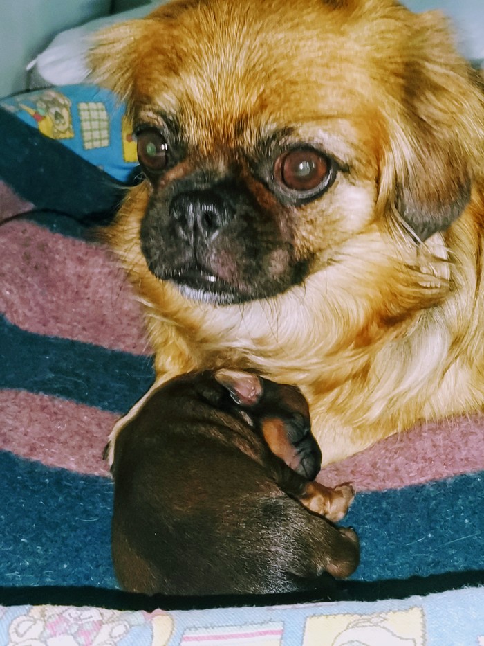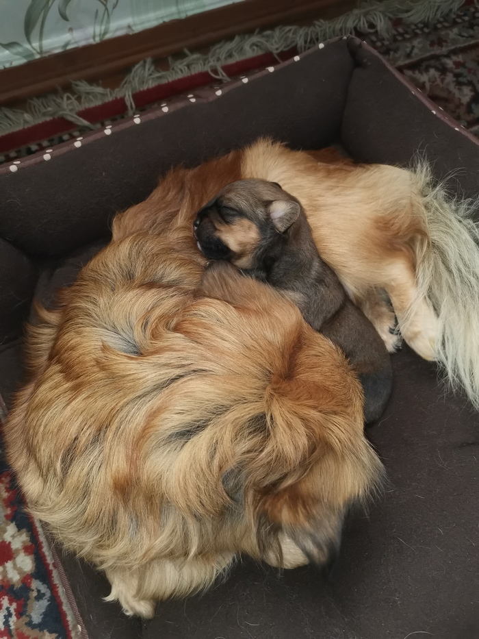 Жила-была пекинесс, сука(по гендерным признакам, не по определению). В течении 5 лет нам удавалось избегать повышенного внимания кобелей в "особенные дни", которые расстянуты до, почти, месяца. Прогулки ранним утром, житие - бытие на даче, за забором...Стерилить мы пока не собирались, планируя вязку с представителем породы ближайшую течку. Знаю, что возраст пограничный для первого ощена, но у нас сложно с поставщиками мужского генофонда. ((Ничто не предвещало "шок-сенсация", но чудесным образом одному кобельку удалось таки нарушить границы не только участка, но и личного пространства нашей дамы. А так как его фенотип был просто сказочным калейдоскопом генов предков (проще говоря - кого там только не было)), то и дите получилось замечательное. Правда, сначала были УЗИ, для уточнения сроков, размеров.