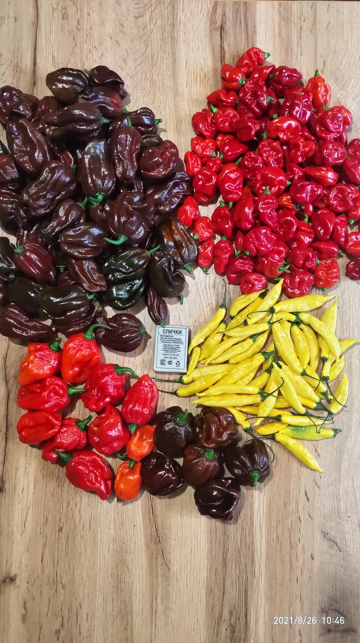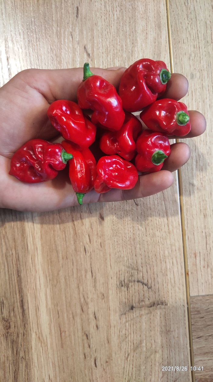 Habanero Chocolate(свои семена) Это наибольшая часть урожая. В этом году самый острый у меня. То ли из-за жары, то ли хз, но после маааленького укуса ушел к холодильнику жрать сметану. Аромат под стать: сильный хиненсовый! Не знаю почему в этом сезоне кусты сильно больше, чем в прошлом и позапрошлом, плоды тоже! Только у этих. Подскажите, если знаете, может переопылился с кем?