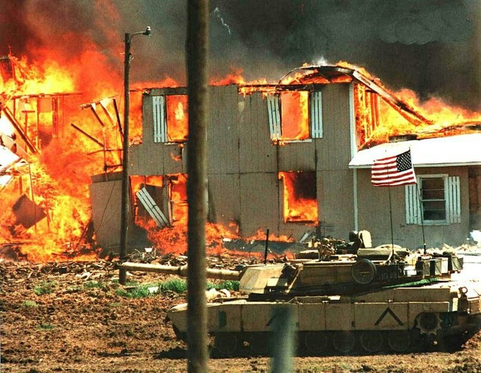 ФБР инициировало осаду, которая продолжалась 51 день и закончилась штурмом с применением бронетехники и вертолётов. Во время событий погибло 82 члена секты, в том числе более 20 детей, а также 4 агента АТФ. В операции было задействовано семь бронетранспортеров Брэдли, четыре БРЭМ, два танка М–1 “Абрамс”, при этом экипажи этих машин были укомплектованы агентами АТФ, которые прошли подготовку в Форт–Брэгг.