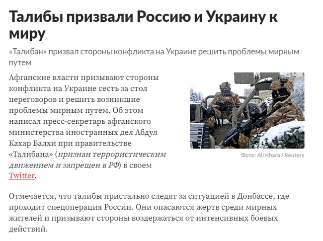 Талибан (запрещенная в РФ организация) призывает Россию и Украину к мирному урегулированию конфликта.