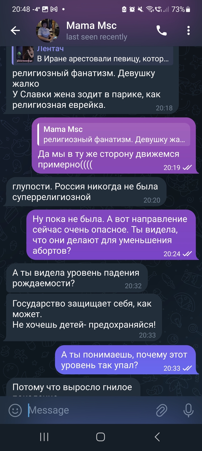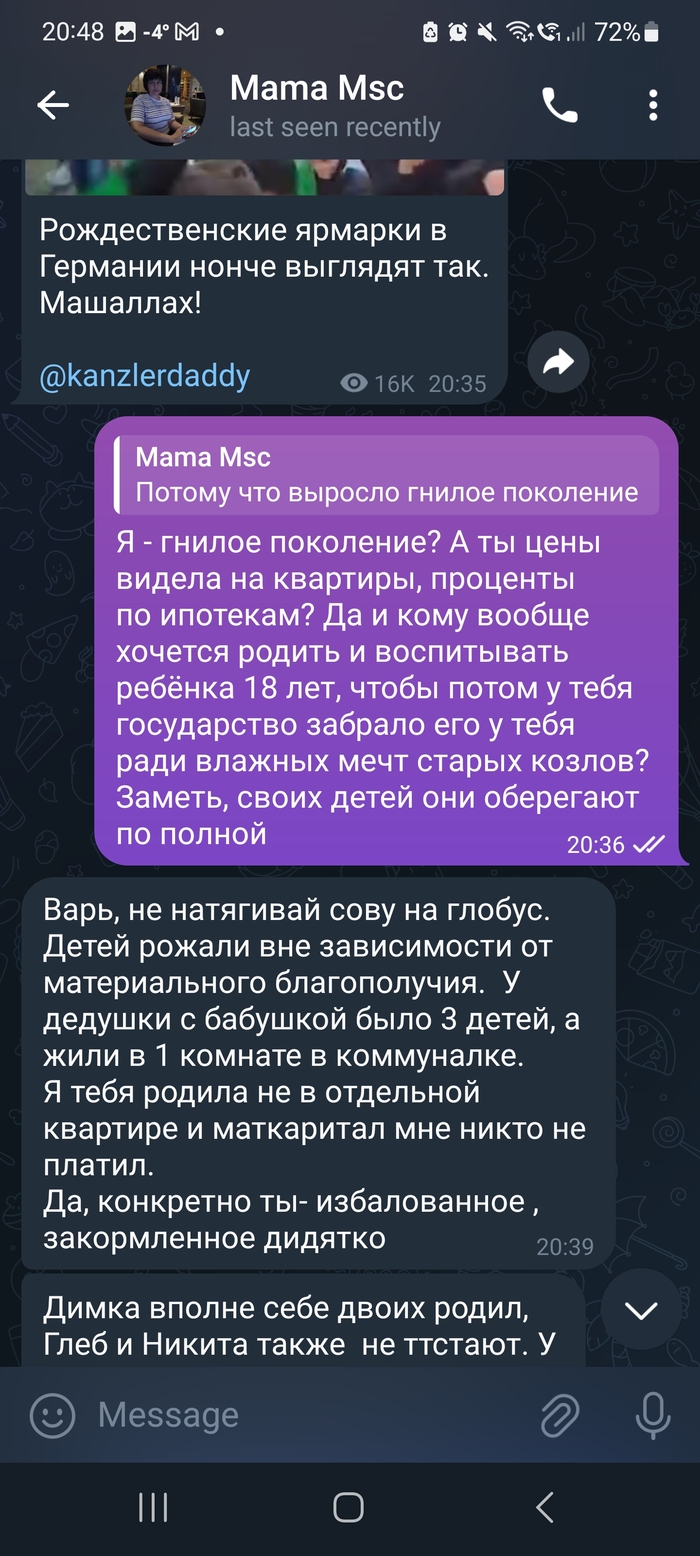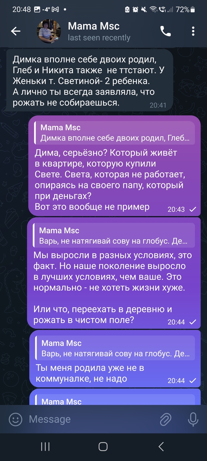 Короче. Мы все говорим о наших причинах не заводить детей, ещё и удивляемся как наши депутаты не понимают очевидного. А я вот сейчас в мамой (63 года) пообщалась, и понимание начало приходить.