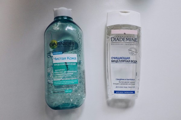 Слева направо: Мицеллярная вода для жирной кожи Garnier, Мицеллярная вода для любого типа кожи Diademine.