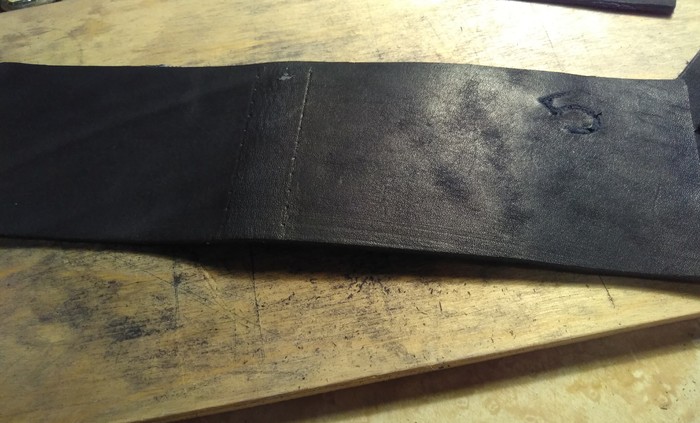 Использовано хз какая кожа, самодельный пробойник из вилки, китайская плоская нить, джонсоновские иглы по коже, и гелевый суперклей, а да еще натуральновосковая свеча на урез.