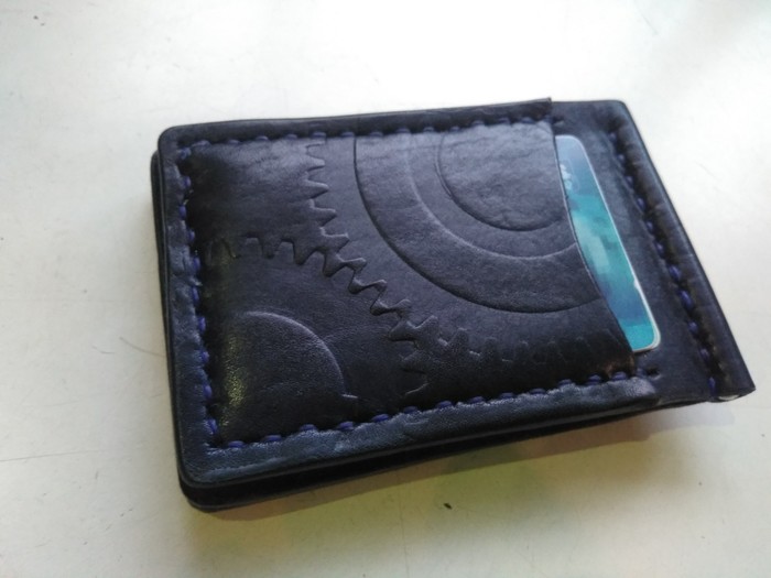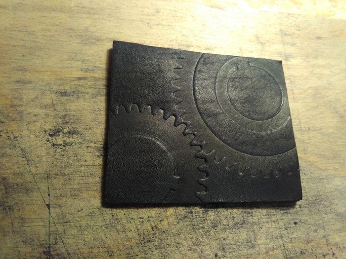 На лицевой в этот раз вырезать ничего не захотелось, решил теснить. Думал над рисунком, долго, потом плюнул подобрал на основной работе шестерни и там же на ручном прессе их оттеснил. Важно шестерни сначала отмыть и обезжирить, так как теснил я первый раз, и пробовал соответственно на не нужном обрезке основную деталь не запорол.