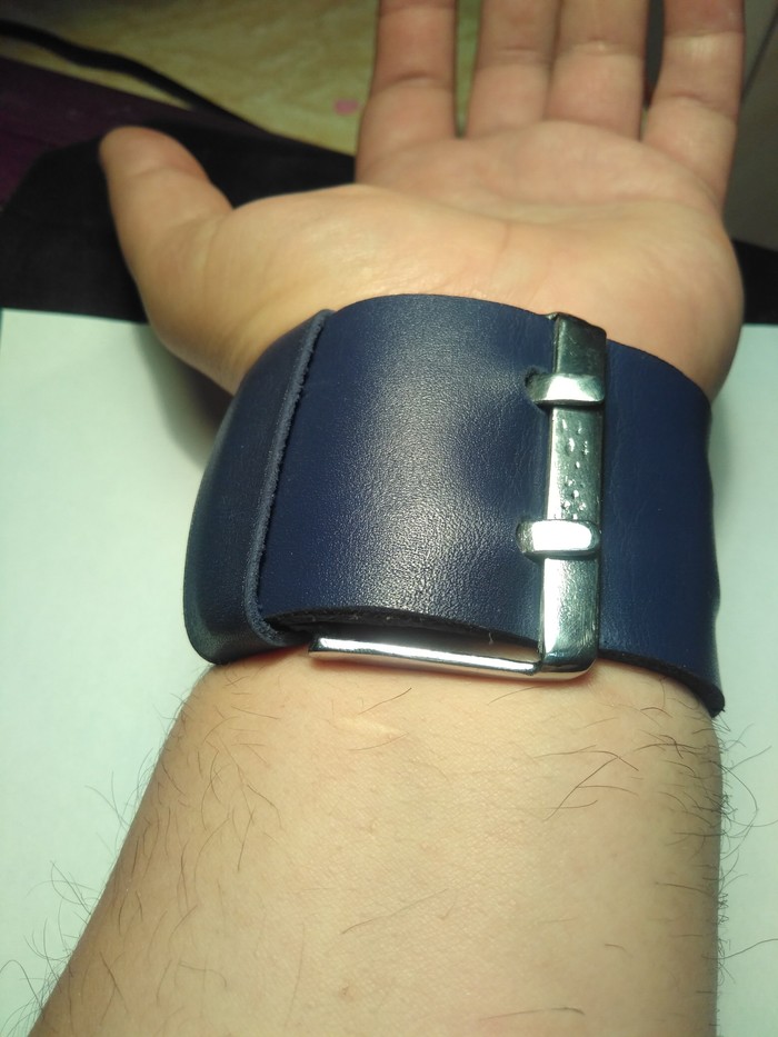 Толстая кожа ~3,5мм, после раскроя, из кого не знаю так как бралась из обрезков. Основную часть на трогал, накладные спустил камнем до ~2,5мм. Сложено по форме куска в виде которого она мне досталась.