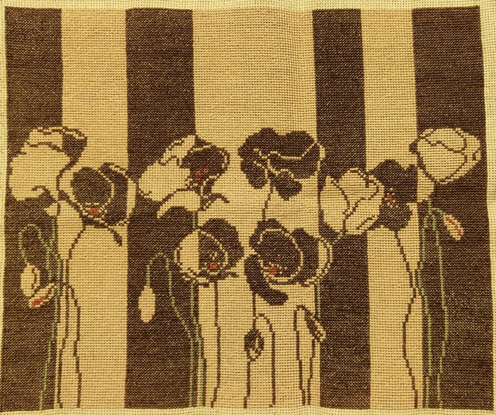 А это самая дурацкая работа.Схема была построена однозначно для врагов. Как-то темные и светлые клетки по рядам не сходились и 4 ряда темной вышивки могли соответствовать 3-м светлой. Вобщем при сопоставлении полагалась на дамскую интуицию. Вышивка и неприметная,но чем-то она меня зацепила.