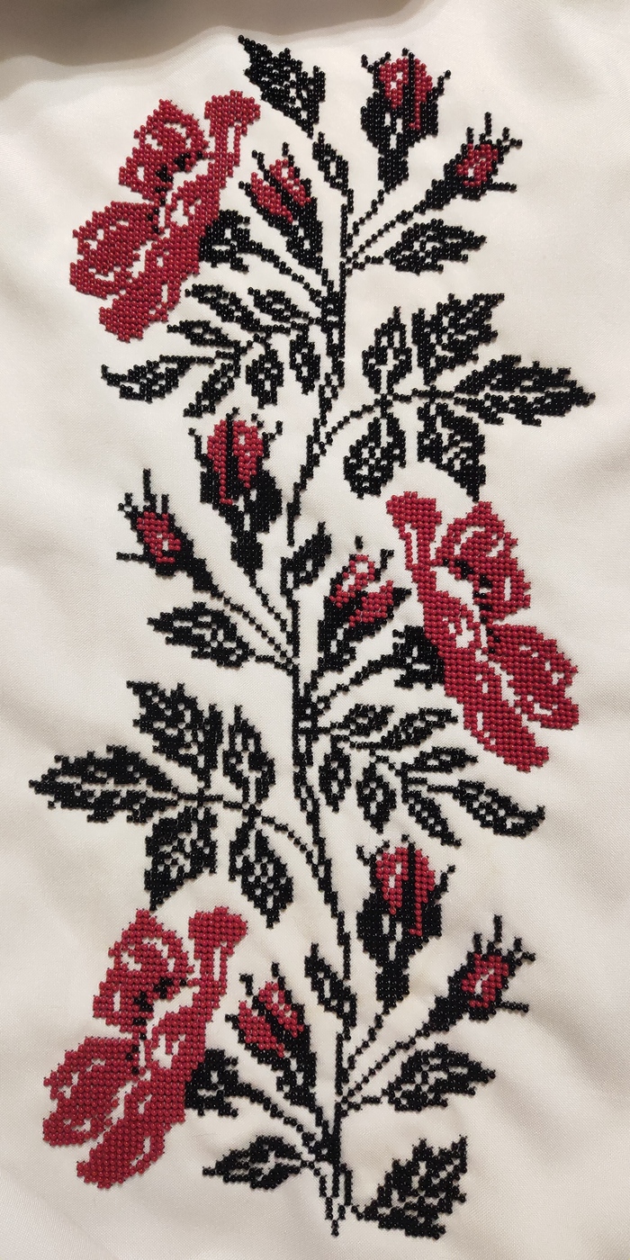 Вышивался меланжевыми нитками,видела в разных цветах,но в красном ,имхо,одно из самых удачных исполнений.