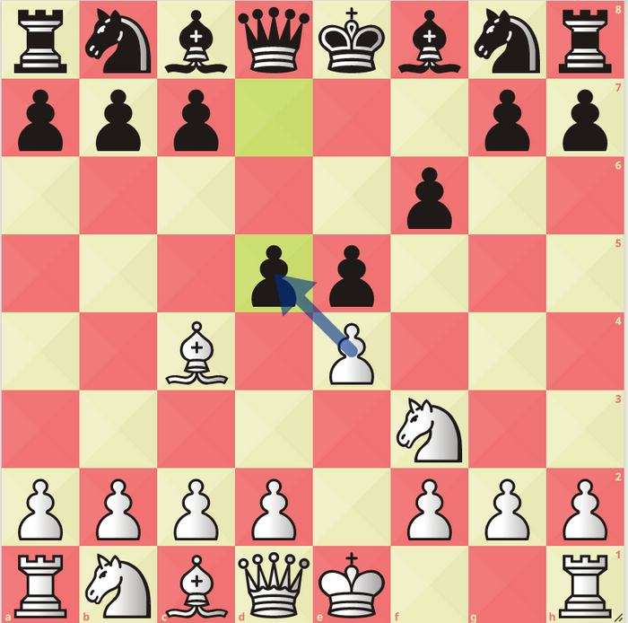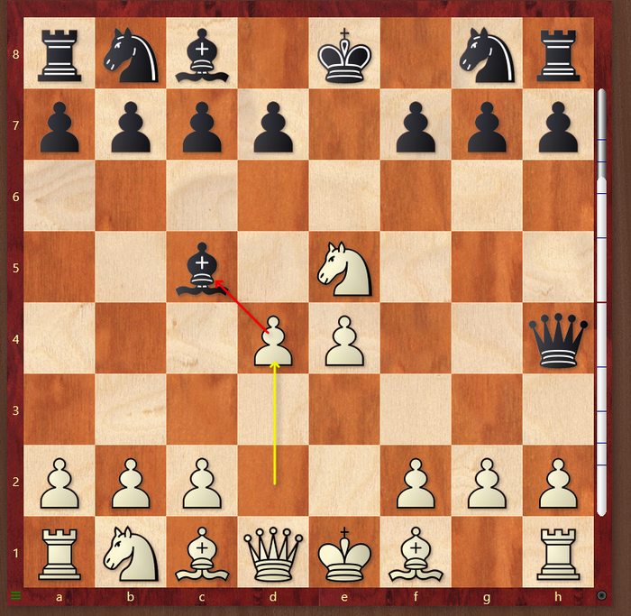 Я задумывал сыграть Шотландскую партию, как соперник сходил 2... Сс5, я аж оторопел, дело в том что это уж очень любительский ход и очень любительский дебют за черных, он даже в списке основных дебютов не присутствует. Немного теории. Это гамбит Буша-Гасса, черные жертвуют пешку е5 за очень небольшую и очень сомнительную компенсацию якобы в развитии. Это ход либо настолько любителя, либо попытка ввести в ступор соперника. На какое-то мгновение моему сопернику это сделать удалось, а вот как я его наказал, мы рассмотрим в дальнейшем течении партии. Ну и конечно же 3. Кхе5 - беззащитную пешку я забрал. Наиболее важными линиями являются 3.... Фe7, попытка вернуть пешку, или 3... Сxf2, идущий ва-банк. И если Фе7 как-то еще оправдано, то жертва слона не несет никаких преимуществ черным.