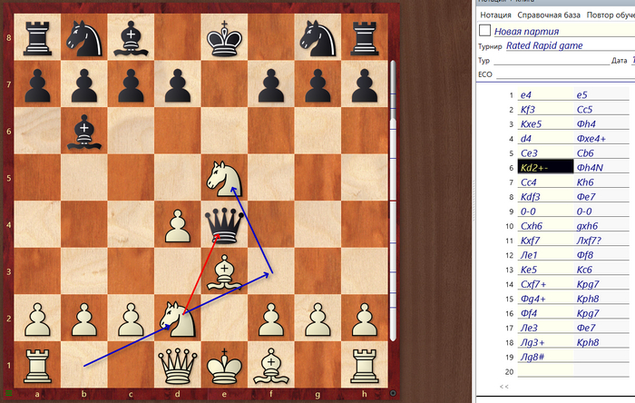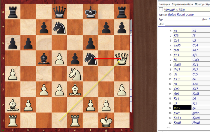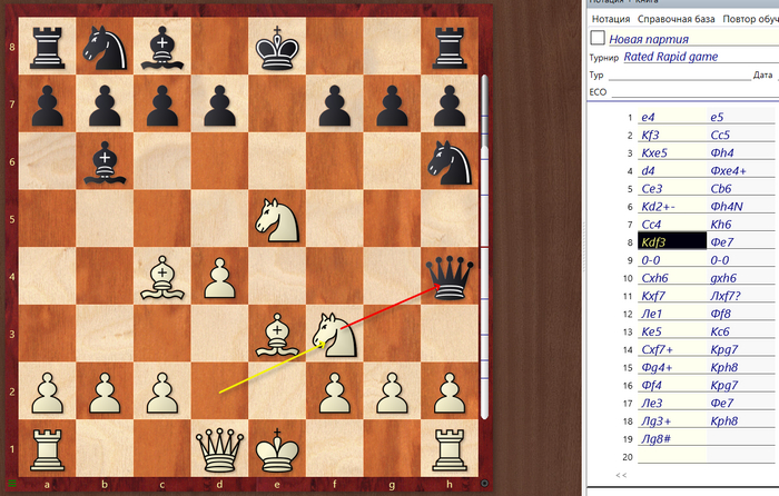 ... 10. Схh6 - взятие коня 10... gh - и конечно же жертва коня 11. Кf7 - хочу сразу предупредить любителей и начинающих, каждая жертва должна быть полностью просчитана с учетом, что соперник будет делать самый сильный ход, но именно ваша жертва несмотря на сильнейшие ходы соперника все равно приводит к победному результату. Если в ваших расчетах подобного нет и/или вы надеетесь ,что соперник будет делать только те ходы, которые вы от него ждете или у него есть такой ход, который полностью перечеркивает выгоды от отданной фигуры - но вдруг он его не заметит, то откажитесь от жертвы и ищите другие варианты ходов. Ведь если вы видите сильнейшие ходы соперника, то и соперник их обязательно увидит... А вот если в совершении ходов соперник допустит ошибку, то вы выиграете просто быстрее. Я не думал, что соперник возьмет коня 11... Лf7 - я считал что последует 11... Кс6 попытка развития и на двойной шах, он спрячет короля в угол на h8 и попробует как-то начать оборонятся, но взятие последовало