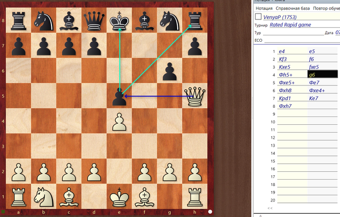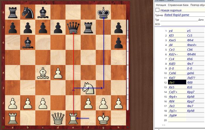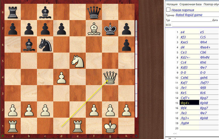 вот теперь последовало взятие связанной ладьи на f7, соперник конечно ферзя отдавать не стал, увел короля из-под шаха, на последовавший потом 15. Фg4+ Крh8 - далее идет мат в 4 хода.