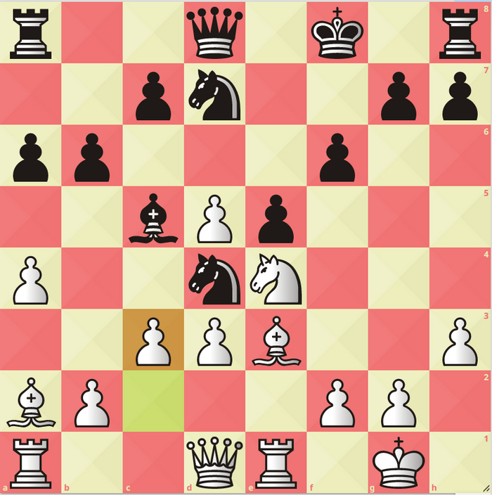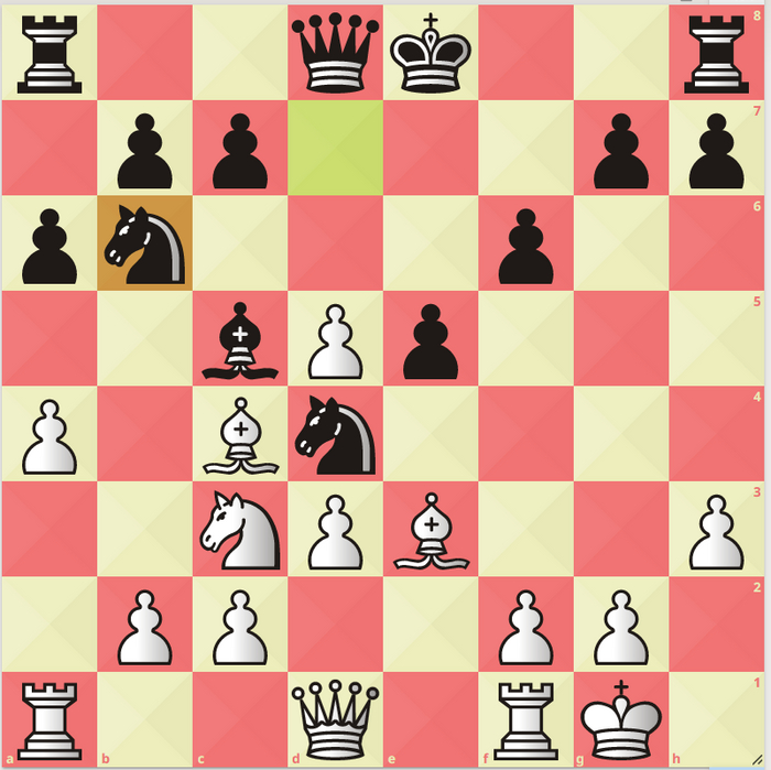 К 13 ходу черным удалось развить легкие фигуры, наладить контригру, даже создавать некоторые угрозы, но застрявший король в центре свел эти усилия черных на нет. 12.... Кb6 - мысль черных понятна - разменять коня на белопольного слона. который держит отличную диагональ и мешает рокироваться. Белые отошли Са2, не желая отдавать такого превосходного слона.