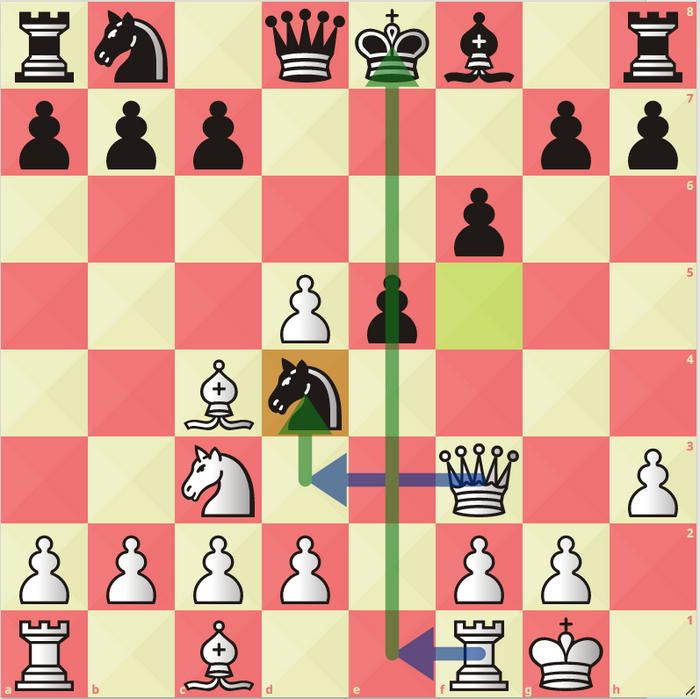 8. Кf3 - у белых все легкие фигуры в игре, и не просто в игре, а забрали под контроль центр, угрожают пешке f7, нападают на ферзя, рокировка будет следующим ходом, в данном случае сложно было играть как-то по другому. В тоже время у черных, обратите внимание на последовавший 8... Фе7 - это четвертый (!) ход ферзя с начала партии, конь на краю доски и под угрозой взятия из-за которого раскрывается "пешечный щит", чернопольный слон "плохой" и в защите короля никак помочь не может, да и угроз никаких создать тоже, и еще 2 легкие фигуры даже не сдвинулись с места. И далее конечно следует рокировка...