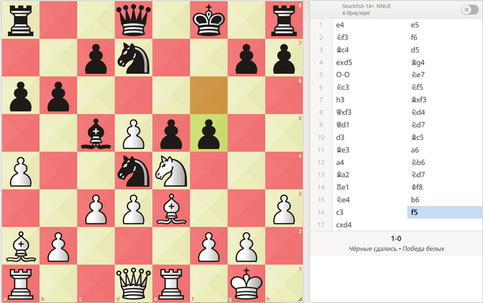 Но как видно по позиции ,все таки вариант с 16... Кf5 был лучше, т.к. 16...f5 - и после 16. схd4 - черные теряют фигуру и соперник сдался.
