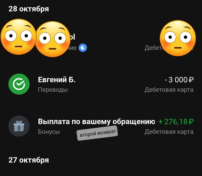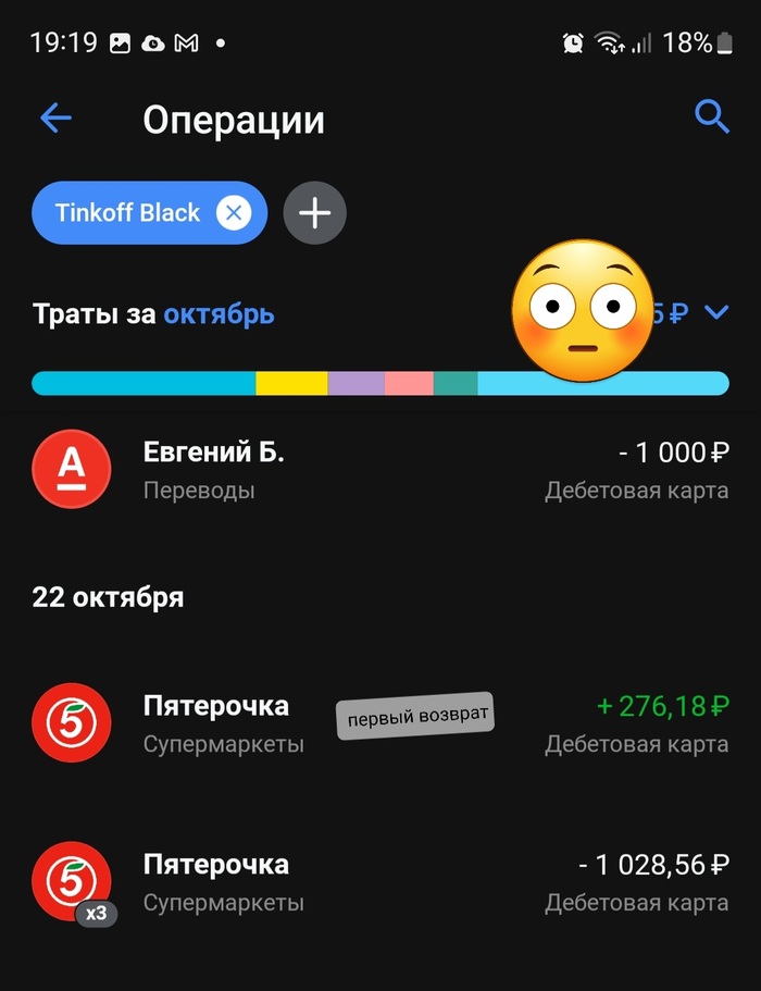На следующий день, пятерочка опять списала 276 руб.))). Опять обращение, опять возврат через тинькофф. Пятерочка гасится в чатах.
