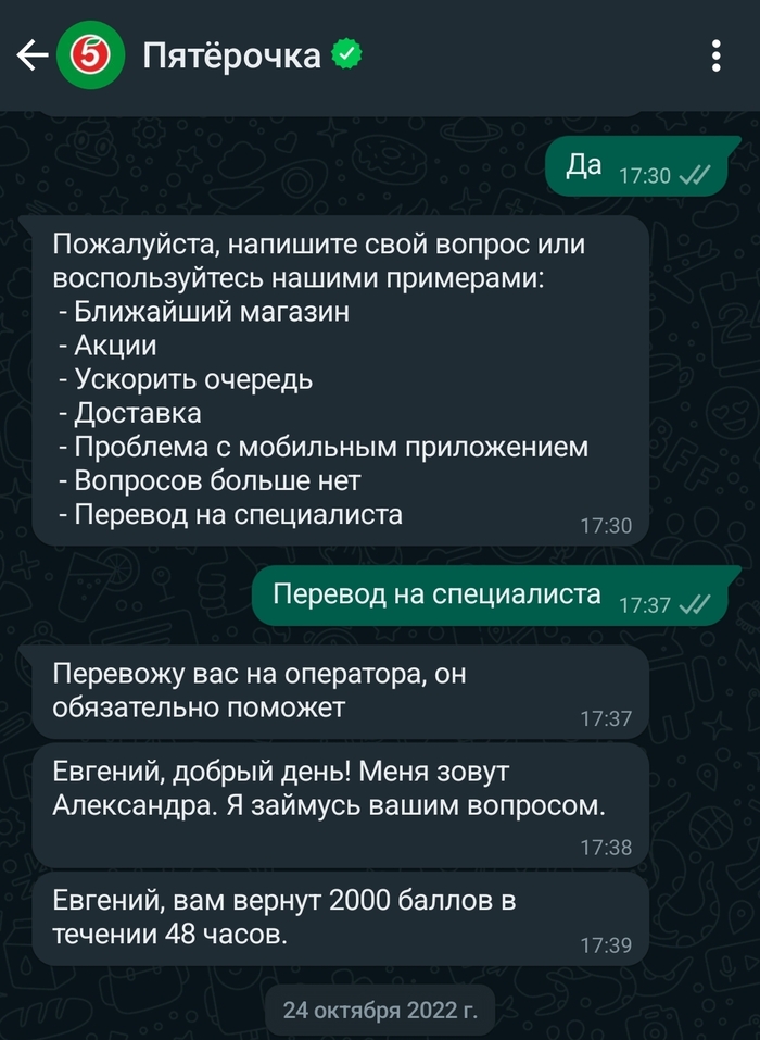 В итоге направил обращения и в тинькофф и в пятерочку. Тинькофф оперативно вернул 276 рублей, пятерочка отписалась, что 2000 баллов вернёт через 48 часов.