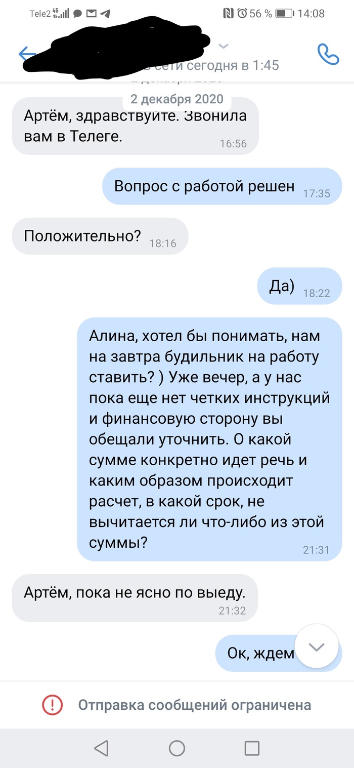 Выдыхаю, перевариваю инфу, звонившая, получив согласие на дальнейшее общение, переводит меня на свою коллегу в ВК по имени Алина, где я через 20 минут накидываю ей список интересующих меня вопросов: