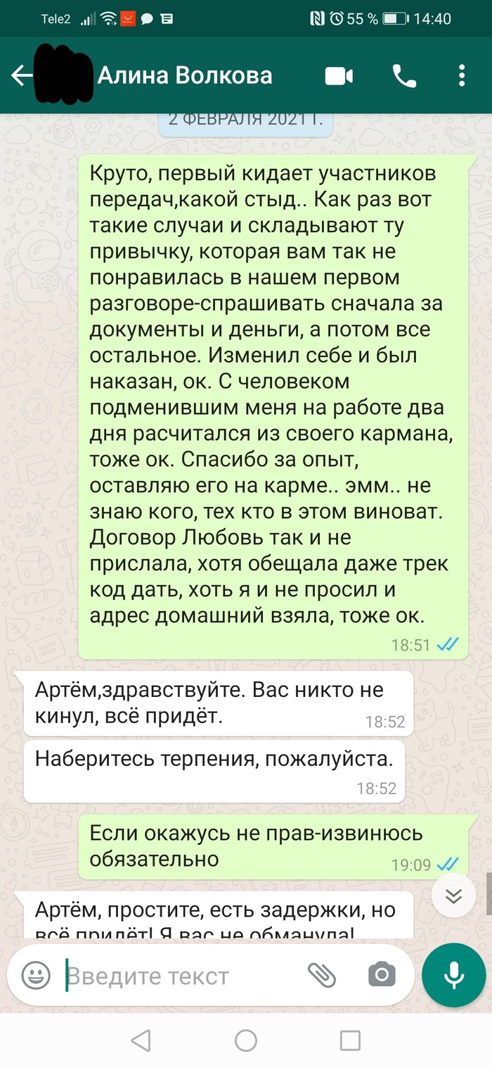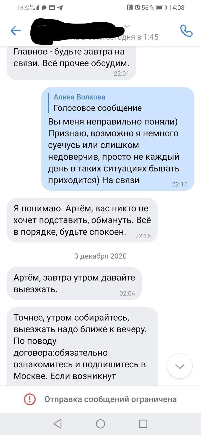 На что получаю голосовуху, в которой Алина обвиняет меня в меркантильности, хотя не отвечает уже сутки на нормальный, прямой и четкий вопрос "когда договор и могу ли я на него посмотреть до перелета в москву и уверяет, что ей тупо некогда, я не единственная ее работа, договор будет и никто меня не кинет.
