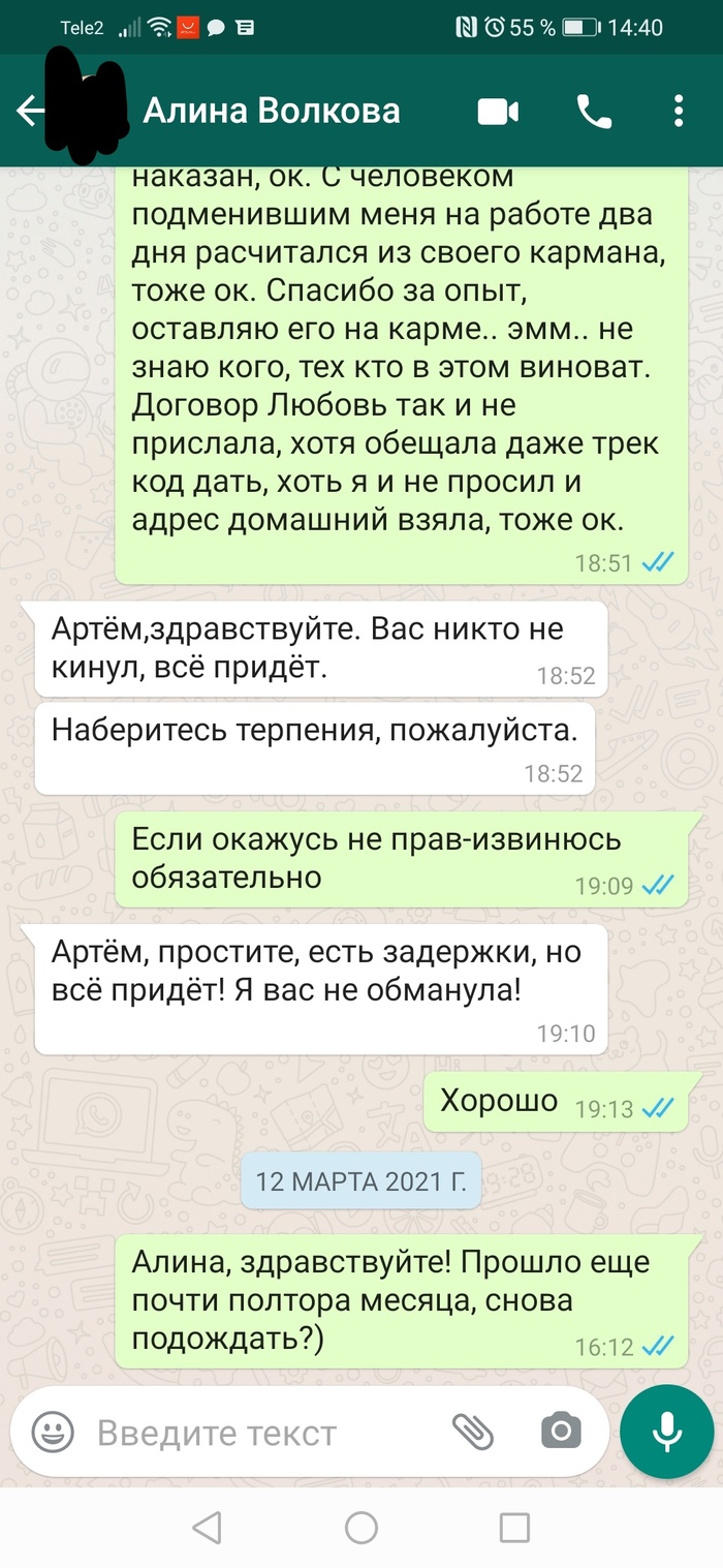 Не получаю ответа и на следующий день пишу открыто о кидалове, на что получаю уверения в том, что я не прав и все будет. В последний раз пишу уже 12 марта и не получаю ответа после чего решаю залить ситуацию на Пикабу: