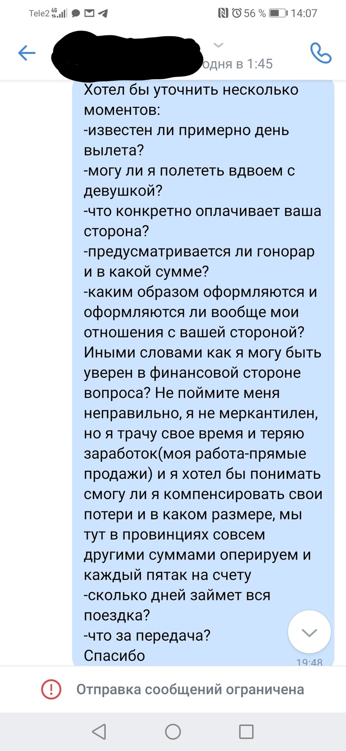 На вопросы мне приходит ответ-голосовуха, в которой сообщается тоже самое, что я уже знал про перелет/проживание/питание из первого звонка, однако игнорируется мой вопрос про договор/гонорар. Думаю, ну ладно, звонившая девушка уже говорила кратко о том, что документы/деньги предусматриваются, время позднее-буду решать с работой, подробнее еще раз задам вопрос позже если сами не ответят. В конце концов Первый канал и все дела.