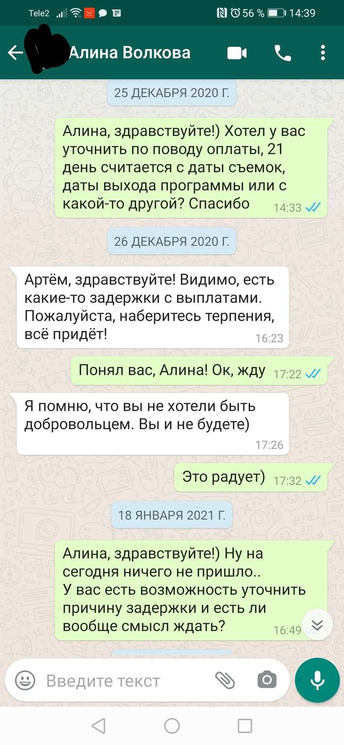 В-третьих, телевидение это контент-мейкер, который демонстрирует этот контент на публику, вставляя в промежутках рекламу и зарабатывая на этом деньги, я им, в известной степени, помогаю. Перед вылетом у меня взяли двухчасовое интервью, в котором интервьюер(та же Алина Волкова) определяет количество и качество имеющихся у меня знаний о предмете передачи, понимая на чем сделать акцент при взаимодействии со мной, например, ведущего. Я фактически работаю на них, для чего и подписывается договор, эта поездка не детский утренник, а работа, а бесплатную работу я делать не готов, о чем сразу сказал представителю канала.