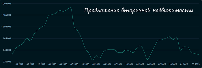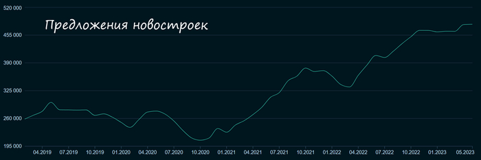 Стоит отметить, что предложение вторички довольно серьёзно упало с 2020 года. Да и локально за этот год тоже. А вот предложения новостроек наоборот растут. За два года уже увеличились в два раза.