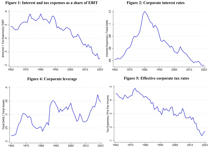 С 1989 по 2019 год реальная корпоративная прибыль росла уверенными темпами - на 3,8% в год. Это почти вдвое превысило темпы, наблюдавшиеся с 1962 по 1989 год. Разница в росте прибыли между этими двумя периодами полностью обусловлена снижением процентных ставок и корпоративных налоговых ставок с 1989 по 2019 год. Один из способов убедиться в этом - сравнить рост прибыли до вычета процентных и налоговых расходов (EBIT). 1962-1989 против 1989-2019: 2,2% против 2,4% в год.
