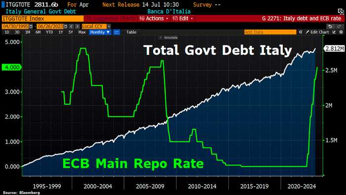 Заместитель главы итальянского правительства Маттео Сальвини заявил, что ЕЦБ рискует спровоцировать рецессию. И вообще вся политика ЕЦБ опасна для людей и бизнеса, ибо государственный долг Италии достиг нового максимума всех времен и народов - 2,8 трлн евро.