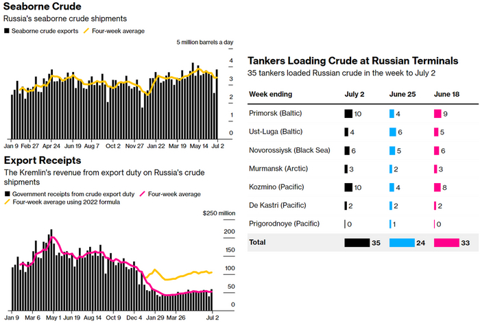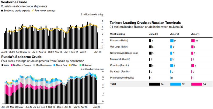 Потоки сырой нефти через российские порты сократились на 980 000 баррелей в день. Снижение отгрузок наблюдалось во всех регионах, но больше всего пострадала Балтика, где в Приморске было загружено менее половины обычного количества танкеров.