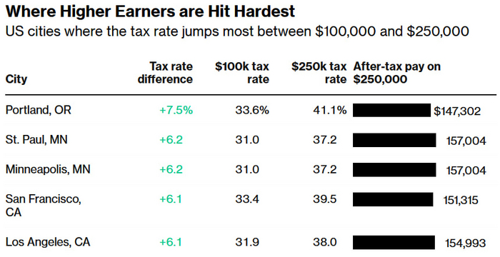 Люди, зарабатывающие в Портленде 250 000 долларов в год, платят налоги, которые на 7,5% выше, чем те, кто зарабатывает 100 000 долларов. Это самый резкий скачок в стране, согласно анализу 76 крупнейших городов США, проведенному SmartAsset.