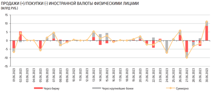 В июне 2023 г. на фоне снижения объемов продаж валютной выручки экспортерами на 22,9% (с 9,1 в мае до 7,0 млрд долл. США) рубль по отношению к доллару США ослаб на 10,4%. При этом пригоженский «мятеж» оказал незначительное влияние на долларовую динамику. Население приобрело валюты (нетто) за последнюю неделю месяца на 4,1 млрд руб., в целом за июнь граждане купили иностранной валюты на 0,3 млрд рублей.